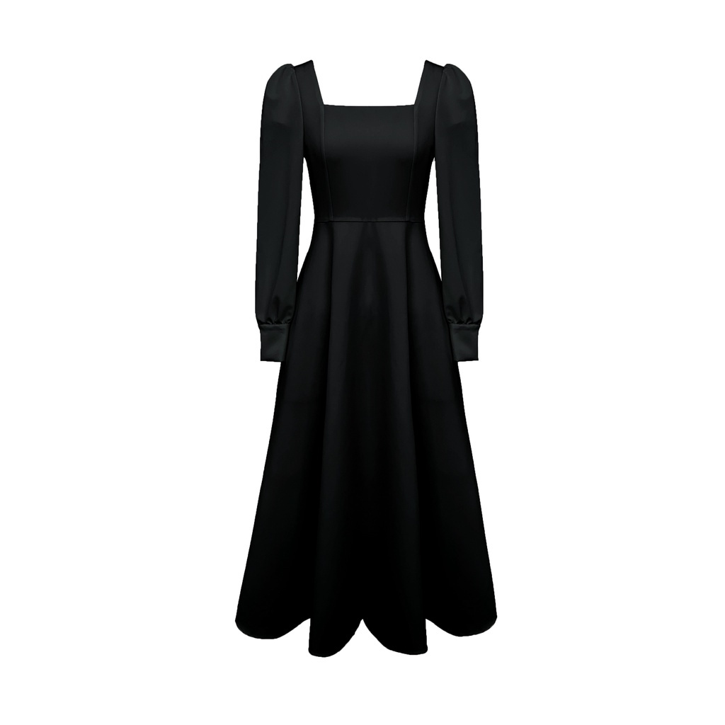 Korea style dress lengan pendek Gaun midi a-line hitam minimalis fashion