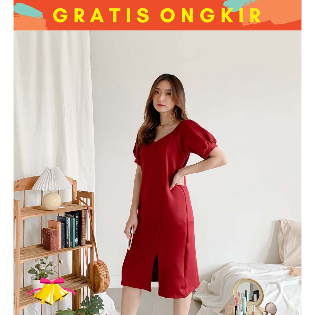 Dress V-Neck Midi Korea Model Sabrina | Dress A Line Print Daisy Lengan Puff