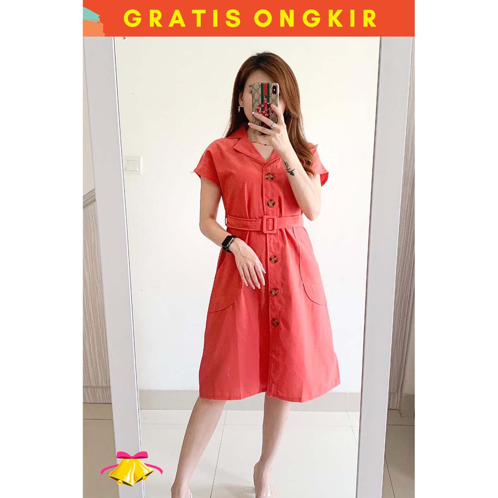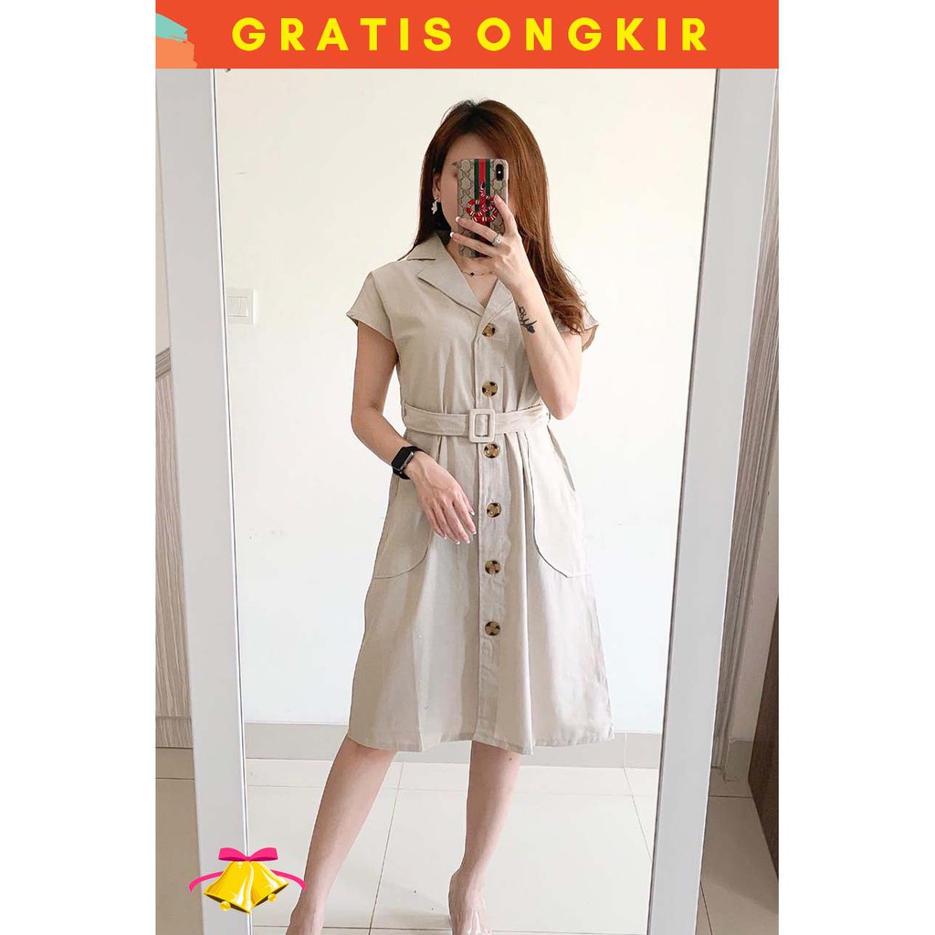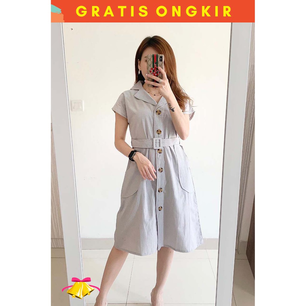 Harga COTTONBELLS CASUAL DRESS WANITA NATYA BUTTON POCKET MIDI TIED FREE BELT (AL - D 3732)