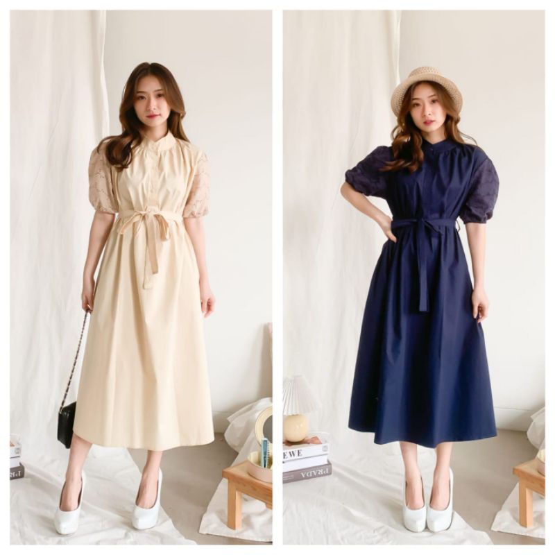 Alasan kenapa harus beli Dalmi Dress - Terusan Midi Lengan Tangan Balon Puffy Sleeve V Neck Pinggang Ikat Casual Bahan Katun Formal Pesta Korean Style Dress Wanita sekarang