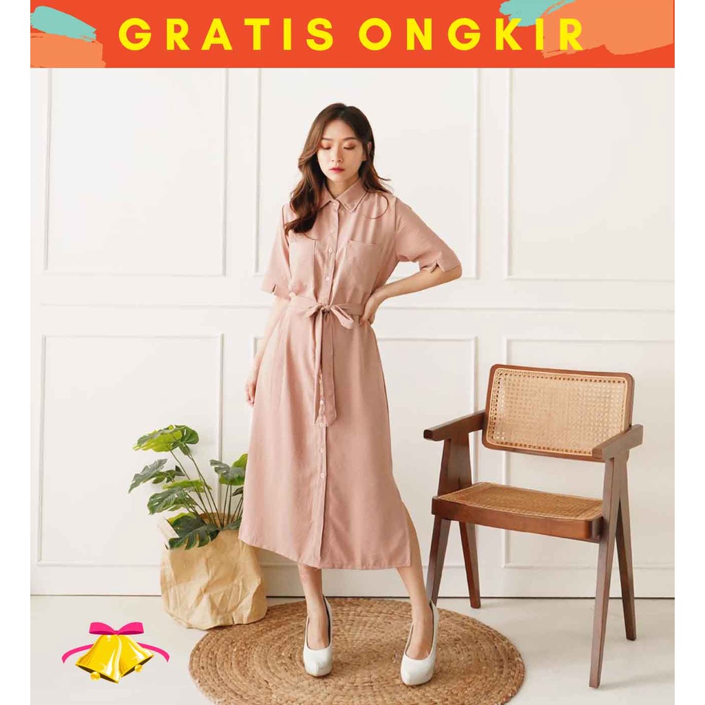 COTTONBELLS CASUAL DRESS WANITA ORIEL BUTTON POCKET TIED MIDI (EO - D 4075)