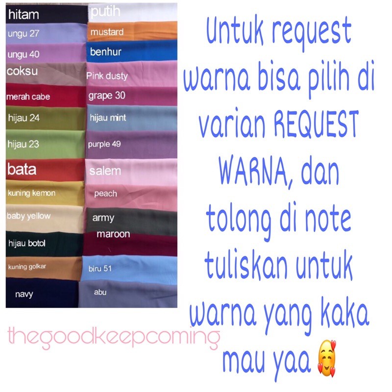 Produk ini memiliki 7 Variasi warna yaitu : hitam,putih,maroon,dusty,peach,coklat susu,request warna,