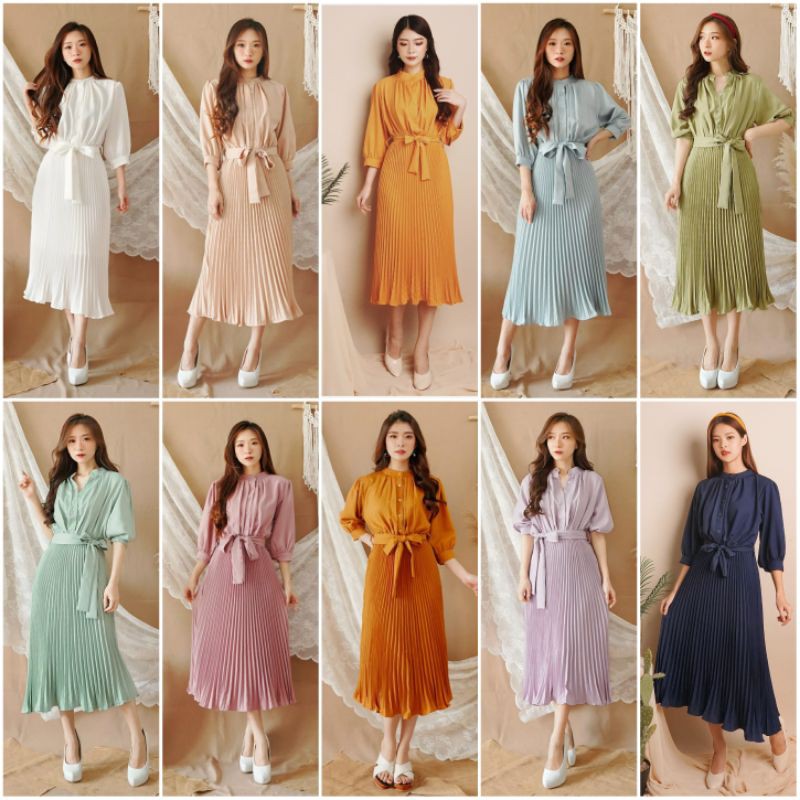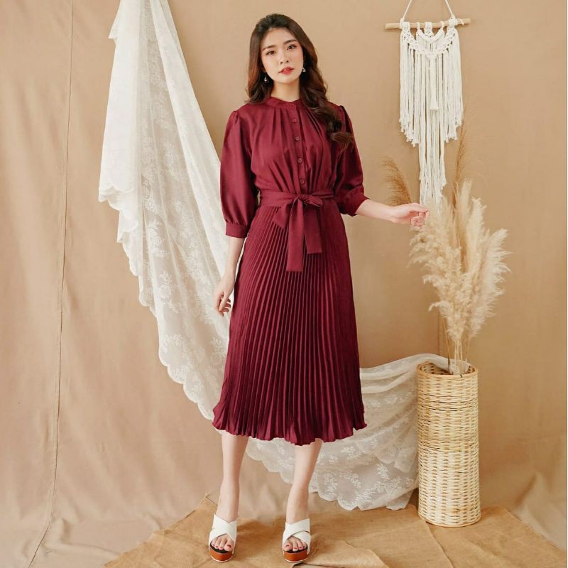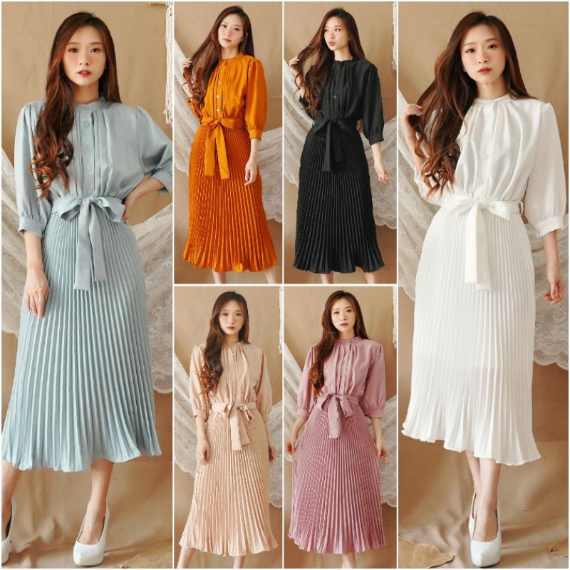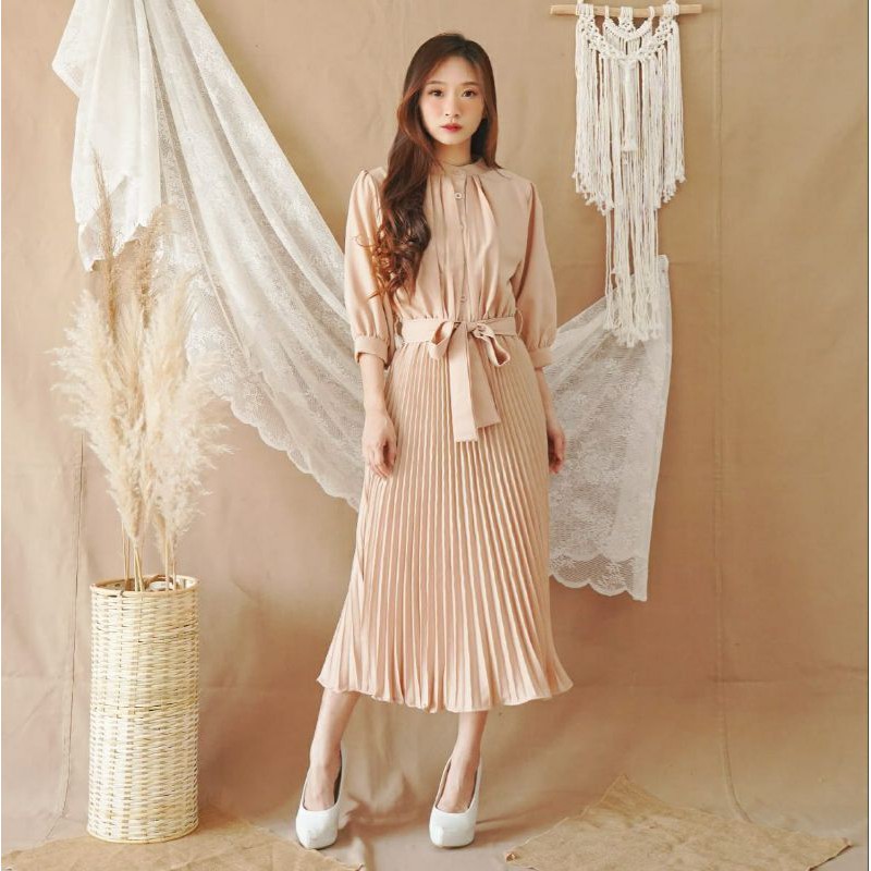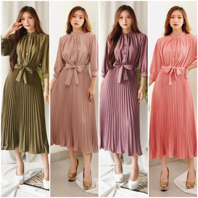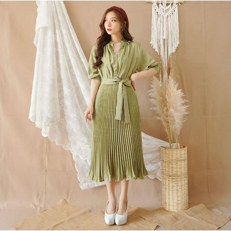 Harga ❣ SPECIAL PRICE ♡ PREMIUM ♡ REAL PIC! GABRIELLE PLEATED BUTTON PLISKET PLEATED OBI TIED MIDI DRESS ( BUSUI FRIENDLY )