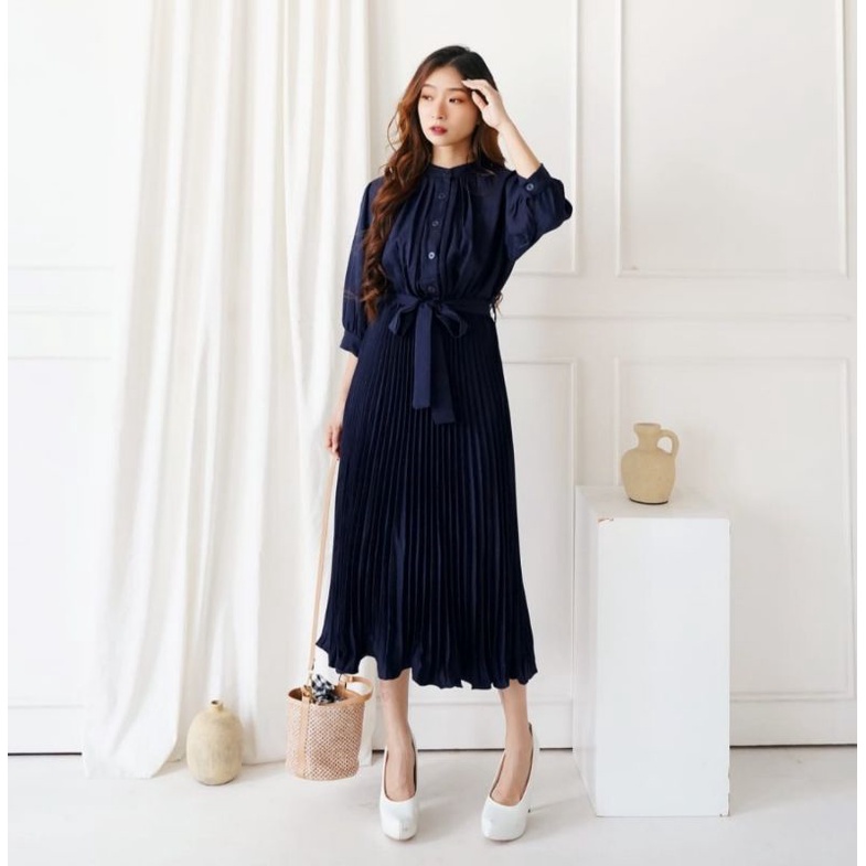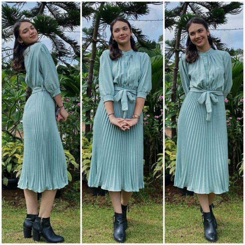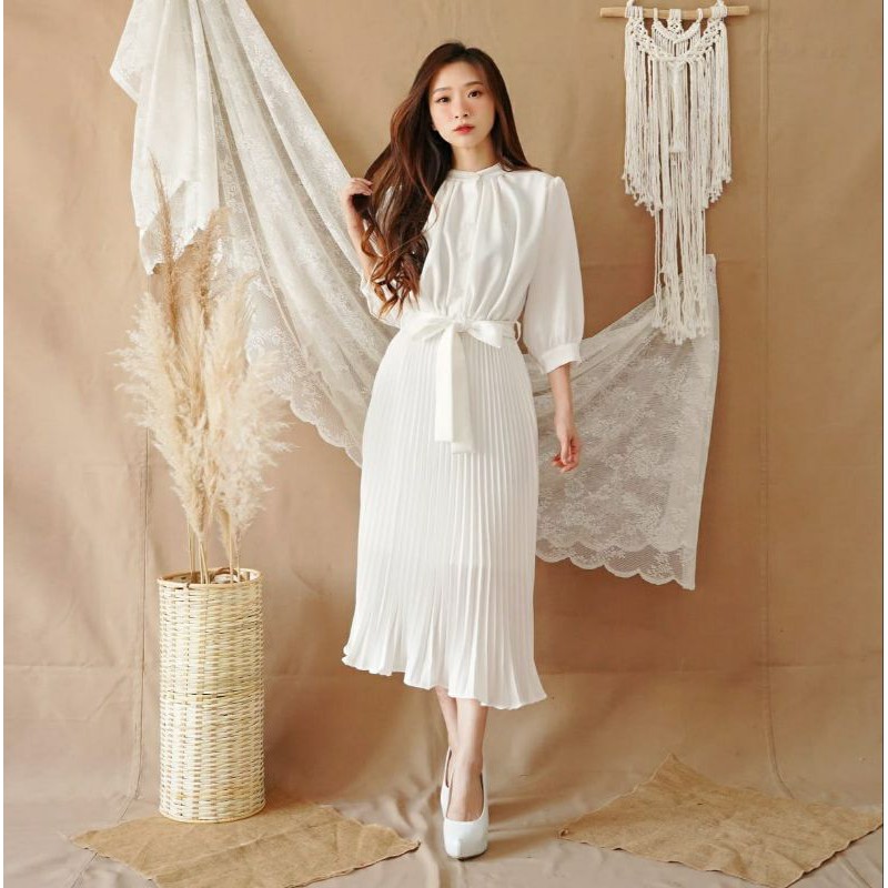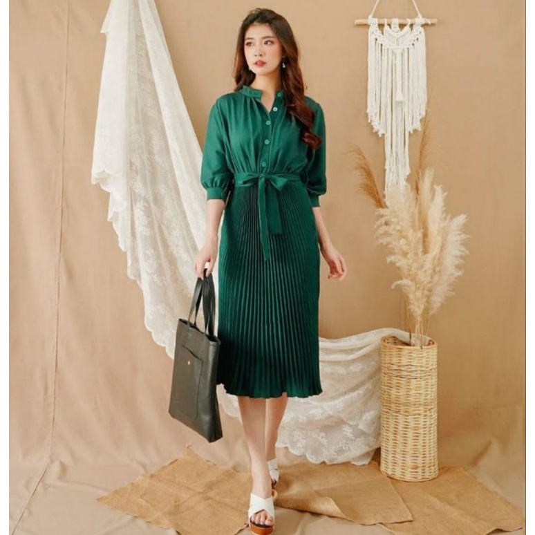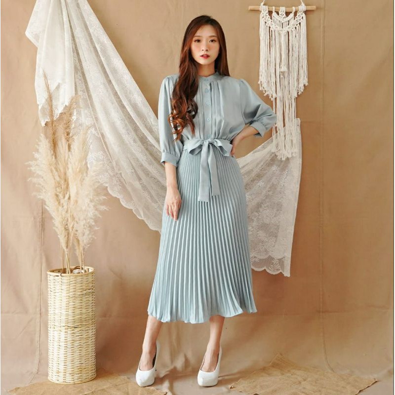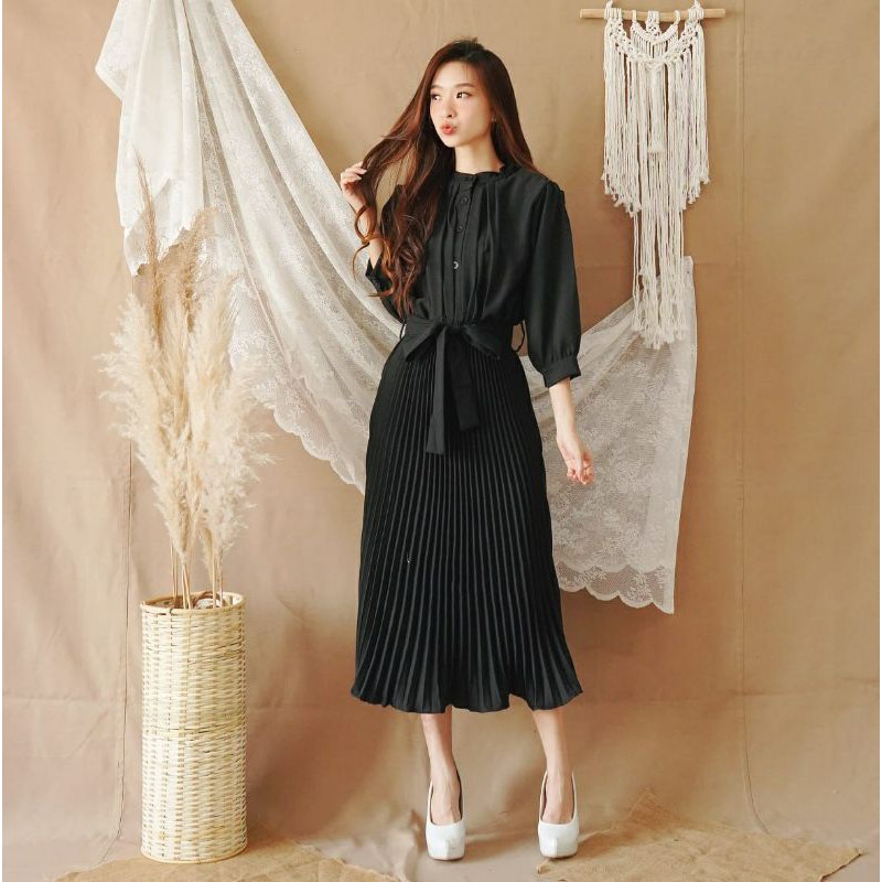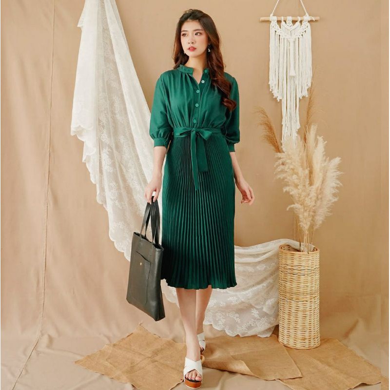 Harga ❣ SPECIAL PRICE ♡ PREMIUM ♡ REAL PIC! GABRIELLE PLEATED BUTTON PLISKET PLEATED OBI TIED MIDI DRESS ( BUSUI FRIENDLY )