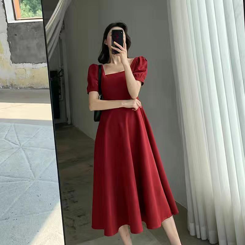 Korean Square Neck Velvet Dress Wanita Beludru Lengan Pendek 1124 (XS-XL)
